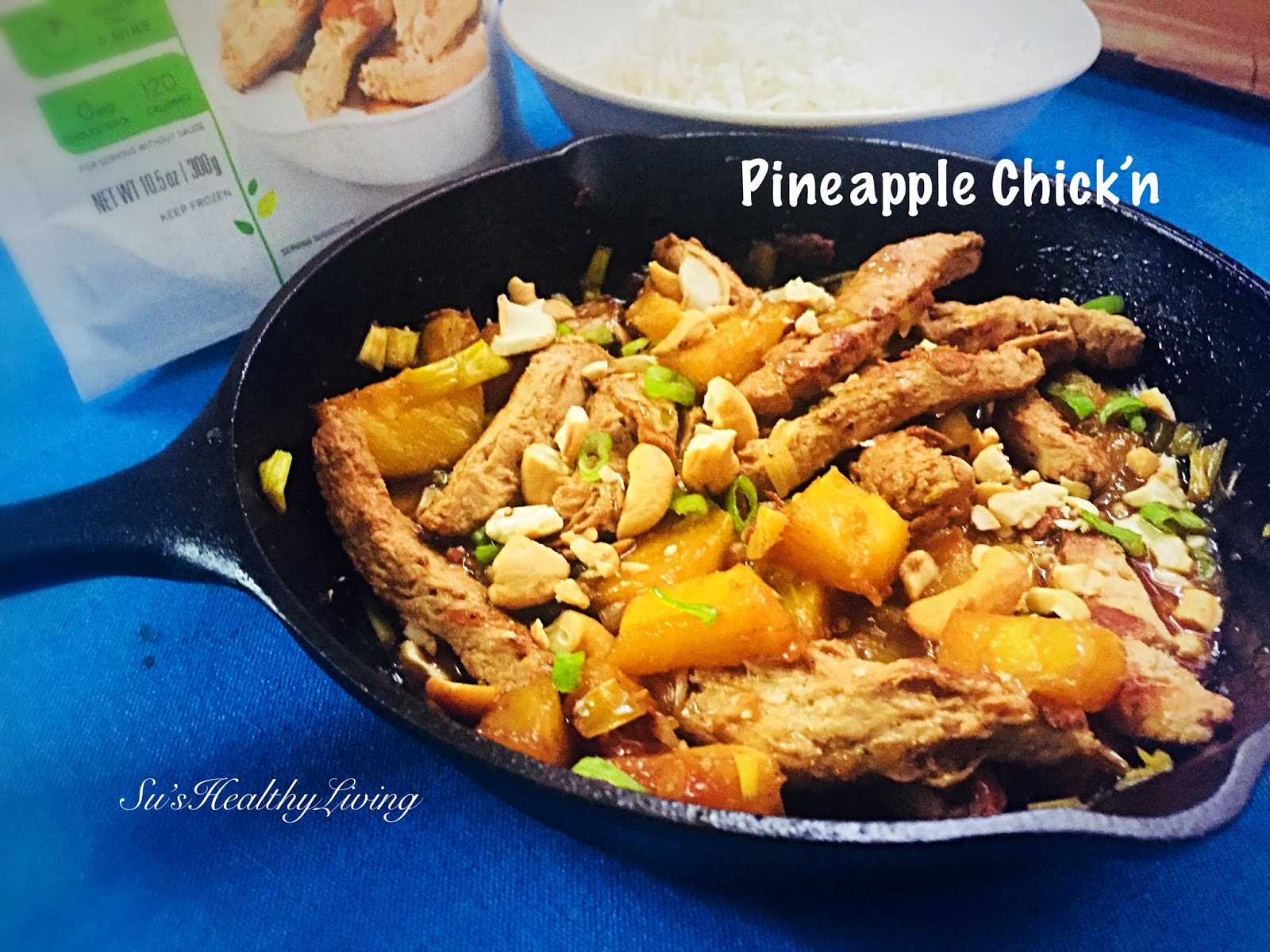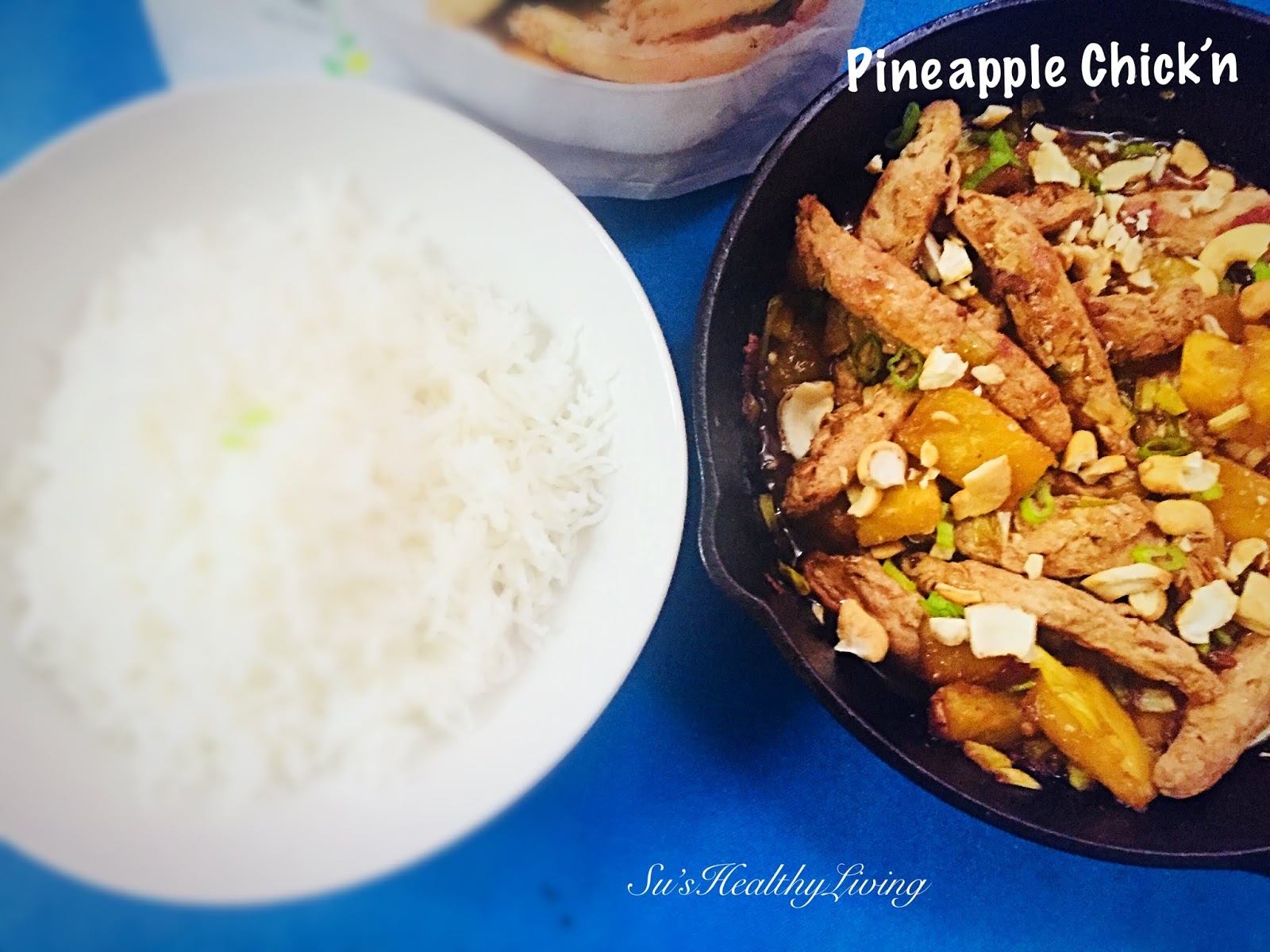 Cook teriyaki chick'n strips as per package instructions until addition of the sauce. Don't add the sauce. Add the pineapple pieces and cook for 2 mins.
